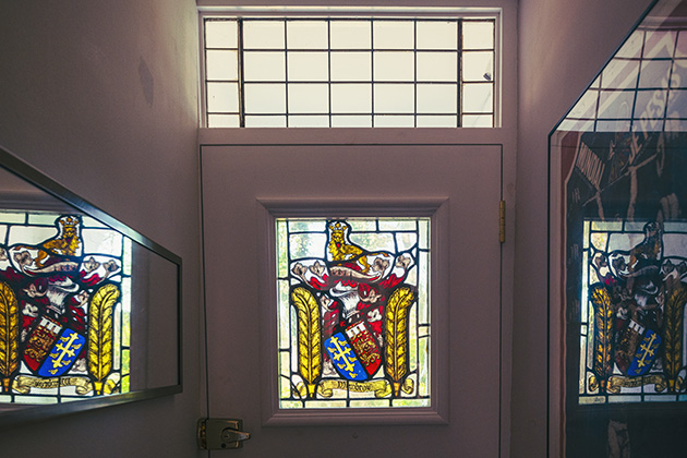 - Bespoke front door installed with antique stained glass coat of arms panel, copper arts and crafts letter box, matching ironmongery
