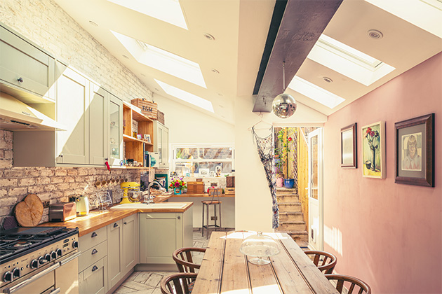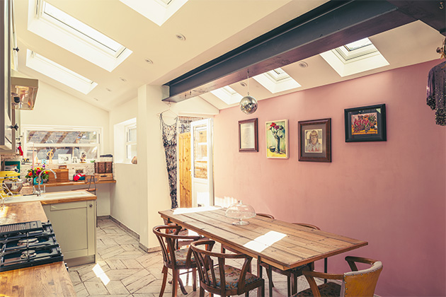 Bespoke steel columns & beams were installed and exposed as I wanted to reveal the integral construction of the new build and for it to be obvious where the original cottage finished and the new build started. The new extension is flooded with natural daylight, enhanced with the installation of velux roof and sash windows.